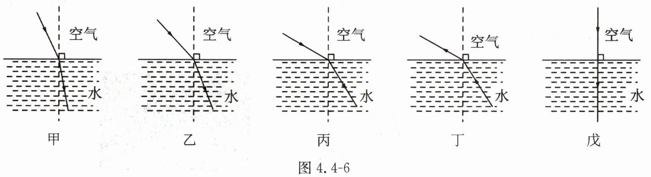 10. 根据课堂上的演示实验,我们总结出了“光从空气斜射入水中或其他介质中时,折射光线向法线偏折”。某同学利用水槽、光源、光屏做了几次实验,结果如图4.4 - 6所示。