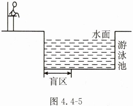 9. 许多同学喜欢游泳运动,但我们必须认识到该项运动也潜藏着危险。如图4.4 - 5所示,救生员坐在泳池边高高的凳子上注视着泳池中的情况,他发现由于泳池边缘的阻挡,泳池底部有一个视觉盲区监管不到。请画一条光线,从盲区边缘的池底处射出,刚好射入救生员的眼睛。