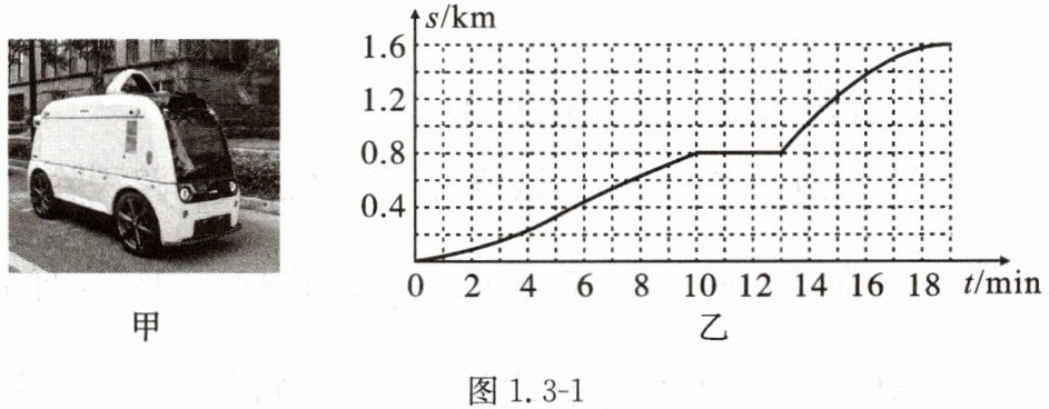 5. 随着$5G$信号的快速发展,$5G$无人配送车已应用于实际生活中,图$1.3 - 1$甲所示为无人配送车沿直线路径前往派送点的情景。该车从出发点到达派送点,完成任务后返回出发位置,其行驶路程$s$与所用时间$t$的关系图像如图$1.3 - 1$乙所示。$0\sim10min$配送车的平均速度为