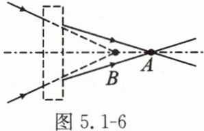 3. 如图 5.1 - 6 所示,一束光线经过一个透镜后相交于主光轴上的 $ A $ 点,取走透镜后,光线相交于 $ B $ 点,则该透镜对光线起到