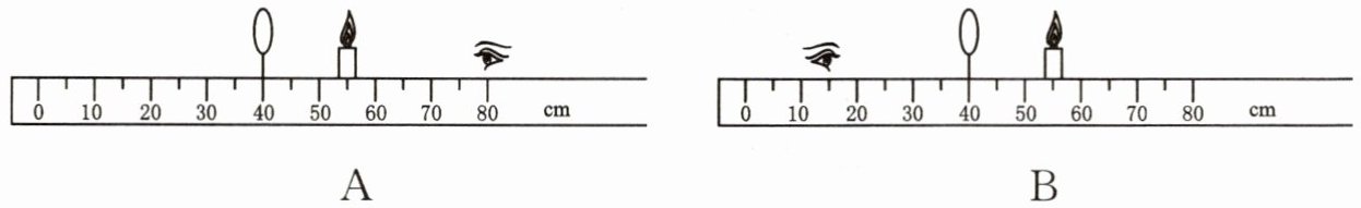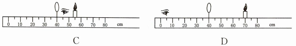 1. 在“探究凸透镜成像的规律”的实验中,凸透镜的焦距是$20cm$,选项中眼睛可能观察到烛焰经凸透镜折射成虚像的是(