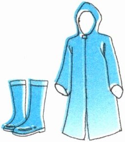 1. jacket 2. gloves, were, under 3. rain boots, raincoat