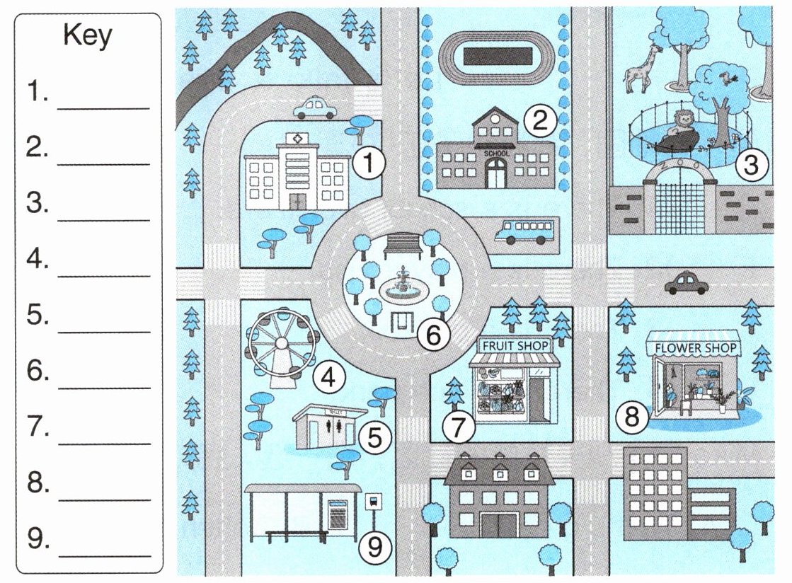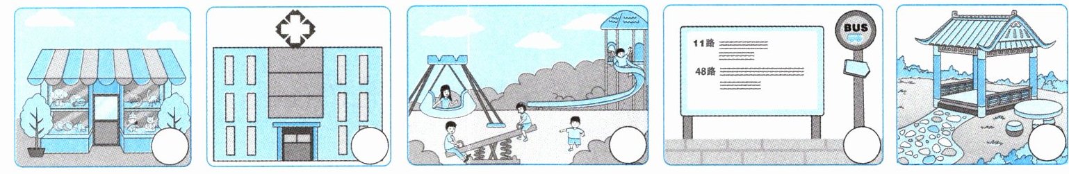 圈出 shop、park、bus stop、hospital 2 5 1 4 3