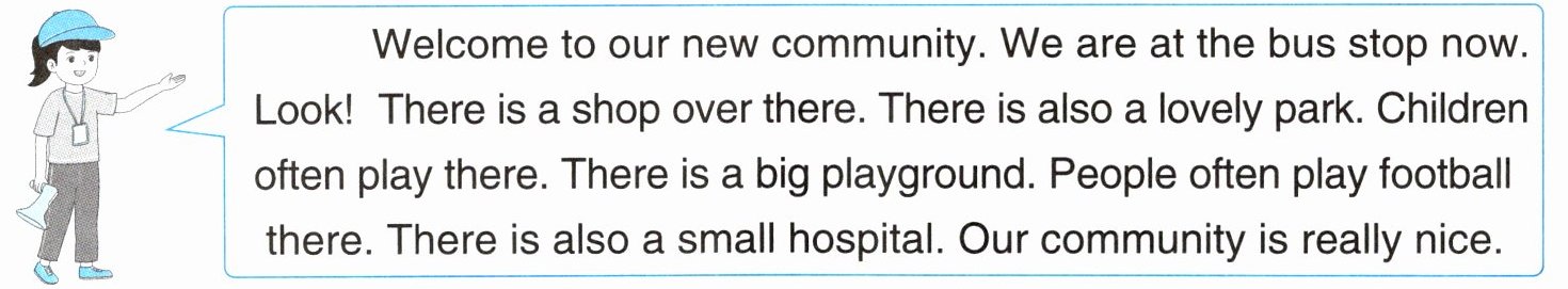读下面的社区宣传语,圈出场所设施,并按顺序用1 - 5给图片标号。