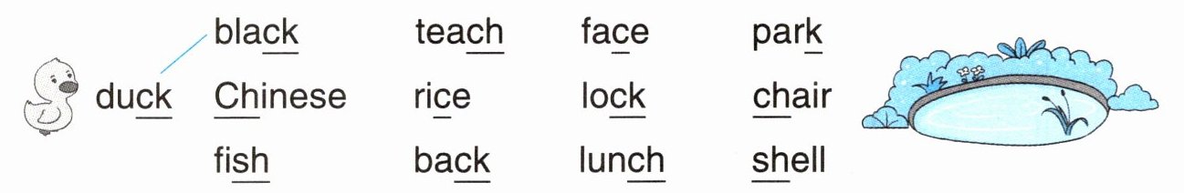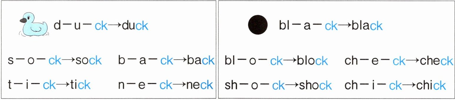 duck; sock; back; tick; neck; black; block; check; shock; chick
