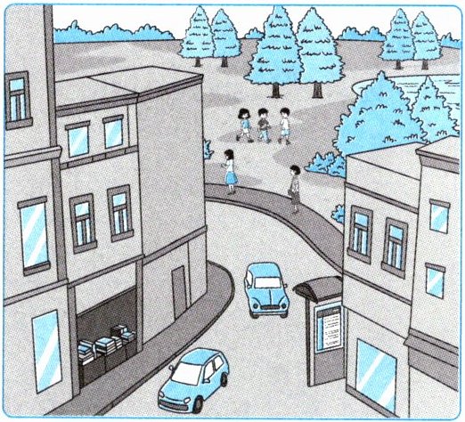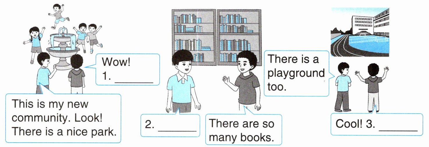 三 观察社区图片,读句子,圈出 be 动词的正确形式。