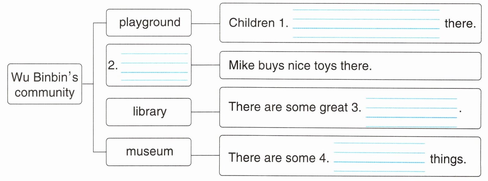 Wu Binbin's community is nice. My favourite place is the park. In the park, there is a playground. Children play games there. There is also a toy shop. I buy nice toys there. There is a library. It is not very big, but there are some great books in it. There is a small museum too. There are some old things. People can read stories about them.