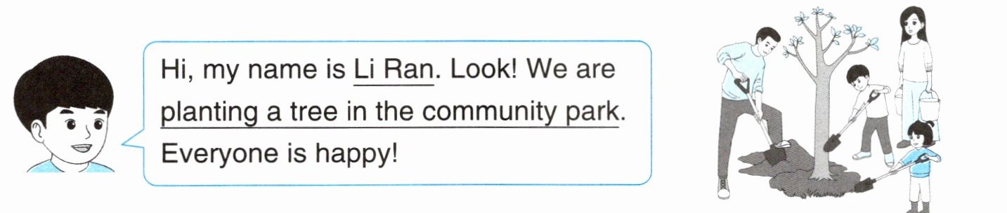 Hi, my name is Li Hua. Look! My father is digging a hole. My mother is carrying water. I am helping to plant the tree. We are all working hard to make our community more beautiful. Everyone is happy!