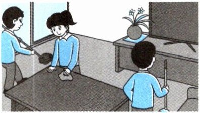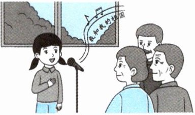 四 观察表演照片,说说小志愿者们在做什么,帮菡菡描述照片里的内容。