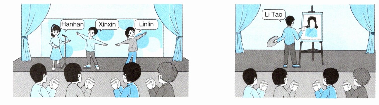 I'm singing a beautiful song. Xinxin and Linlin are dancing happily. Li Tao is drawing a picture.