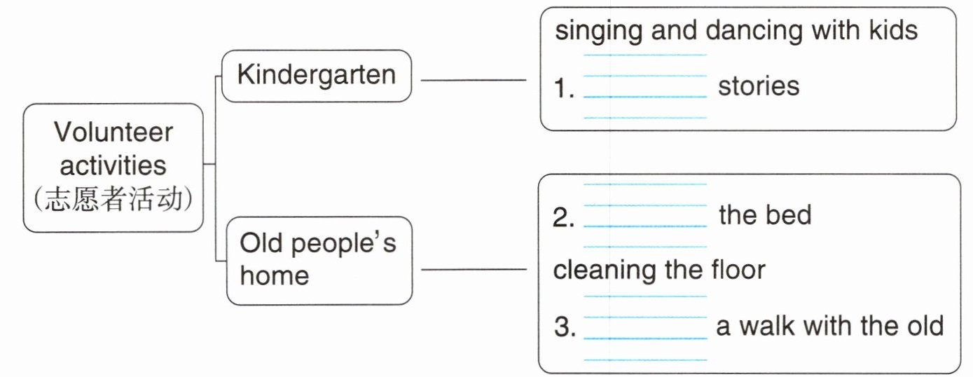 In the old people's home, we are making the bed, cleaning the floor and taking a walk with the old.