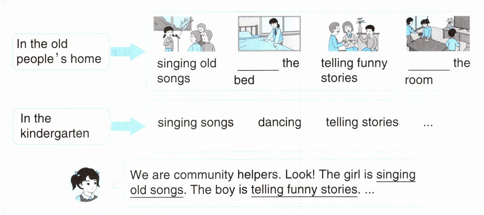 Many workers and helpers make our community better and better. They help in the community. Look! Cleaners are cleaning toilets and parks. Doctors are looking after sick people. The school bus driver is taking students to school. Cooks are cooking delicious food. And look at the community helpers! Some are helping in the kindergarten and some are in the old people’s home. They are singing,dancing,cleaning the room,making the bed,telling stories and playing games. They make people happy. They are happy too.