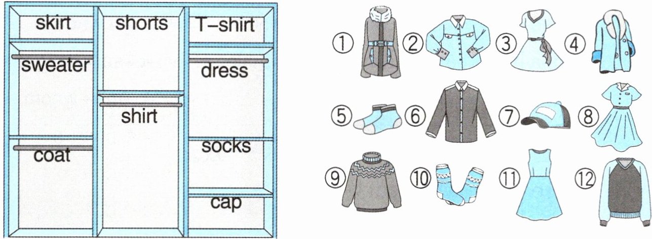 任务一:sweater:⑨⑫ shirt:②⑥ dress:③⑧⑪ coat:①④ socks:⑤⑩ cap:⑦ 任务二:skirt:⑭ shorts:⑮ T-shirt:⑬