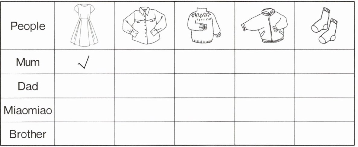 分类整理衣物的时候,琪琪来了,妙妙向她介绍衣物的主人。 读介绍,完成任务。