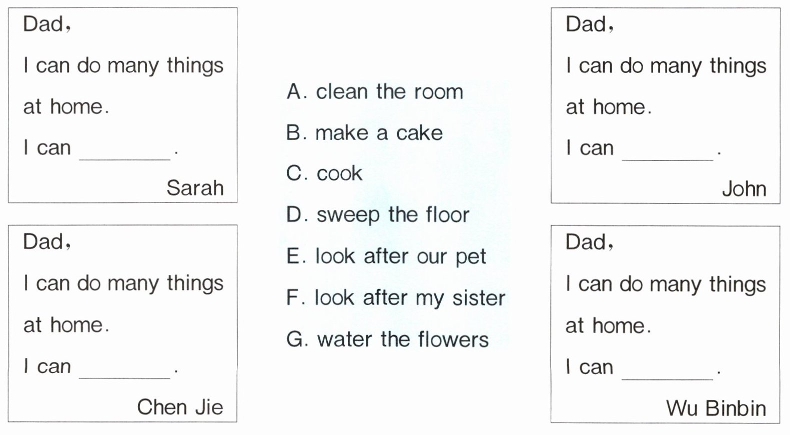 Sarah:A E Chen Jie:C F John:B D Wu Binbin:D G