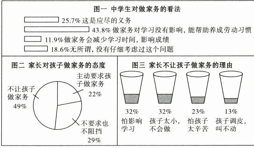 7. ①多数中学生认可做家务的价值(或对做家务持积极态度);②近半数家长不让孩子做家务,主要因担心影响学习和孩子太小不会做。