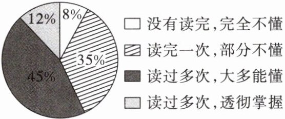 (1)班级同学对《朝花夕拾》的阅读情况中,“读过多次,大多能懂”占比最高(45%),“读完一次,部分不懂”次之(35%),“没有读完,完全不懂”(12%)和“读过多次,透彻掌握”(8%)占比较低。