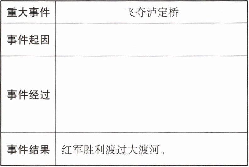(1)事件起因:红军面临被国民党军队包围消灭的危险,需在敌人增援前夺取大渡河上最后的渡口泸定桥以渡过大河。