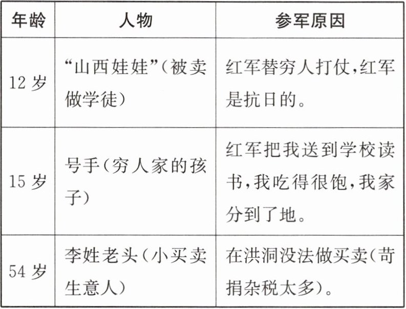 共性:他们都受到当时社会不公(如贫困、被压迫、苛捐杂税等)的影响,红军的政策(替穷人打仗、抗日、给穷人家孩子读书机会、分地等)给他们带来了希望,所以参军。
