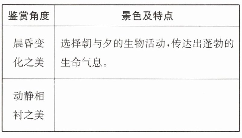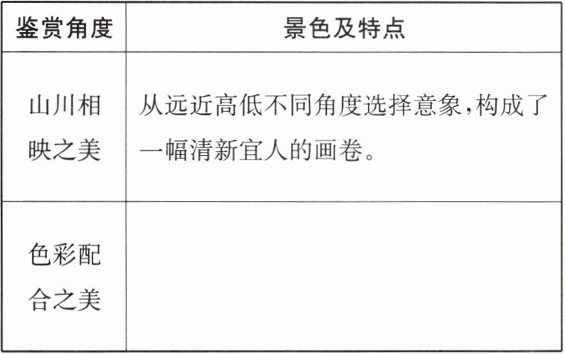 (1)在活动中,兴趣小组给你分配了鉴赏《答谢中书书》的任务,请你结合课文内容填写下表。