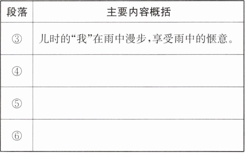 4. 简要概述第③~⑥段中作者想起了哪些和“雨”有关的故事,完成下表。