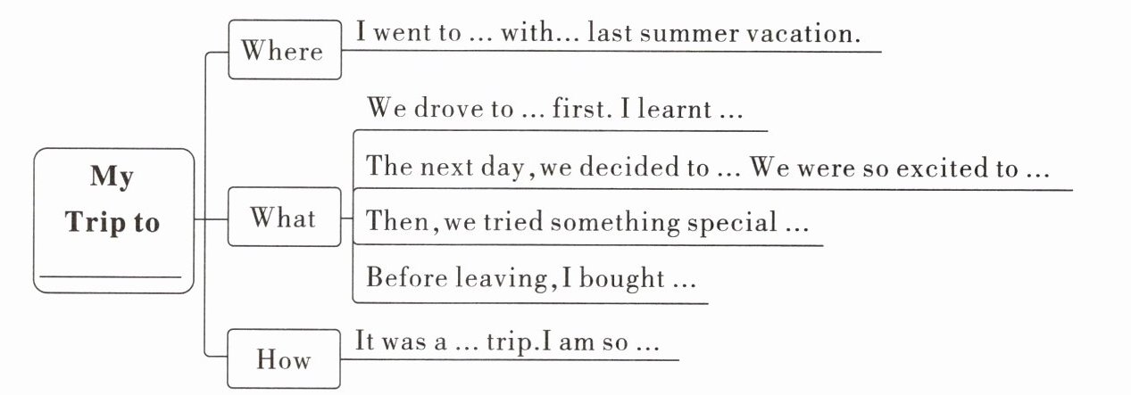 (2) All in all 审题:体裁:记叙文 人称:第一人称 时态:一般过去时 范文:My Trip to Chengdu I went to Chengdu with my sister last summer vacation. The weather was cool and rainy, but it didn't stop our excitement. We took a train there and arrived in the morning. We drove to the Panda Base first. I learnt pandas mainly eat bamboo and sleep most of the day. Watching them roll around made me laugh a lot. The next day, we decided to walk around Kuanzhai Alley. The old streets with red lanterns looked so beautiful. We were so excited to try local snacks like spicy hot pot and sugar cakes. They tasted amazing! Then, we visited Jinli Street and bought some cute panda toys. Before leaving, I bought a silk scarf for my mom. It was a great trip. I am so happy to experience the culture and food there. I hope to go back soon!