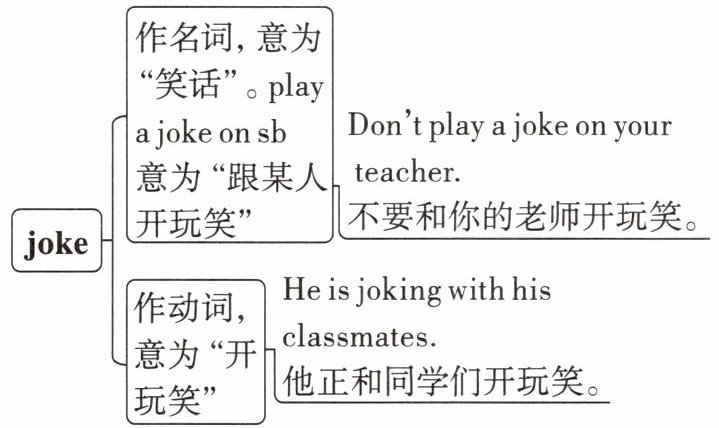 joke作名词,意为“笑话”。play a joke on sb 意为“跟某人开玩笑”Don't play a joke on your teacher. 不要和你的老师开玩笑。作动词,意为“开玩笑”He is joking with his classmates. 他正和同学们开玩笑。