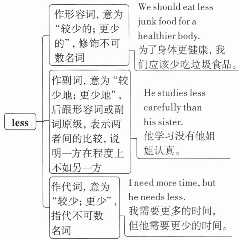 - 作形容词,意为“较少的;更少的”,修饰不可数名词