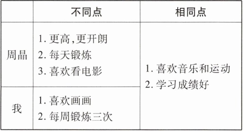 However, there are some differences between us. Zhou Jing is taller and more outgoing than me. She exercises every day, but I exercise three times a week. She likes watching movies, while I like drawing pictures.