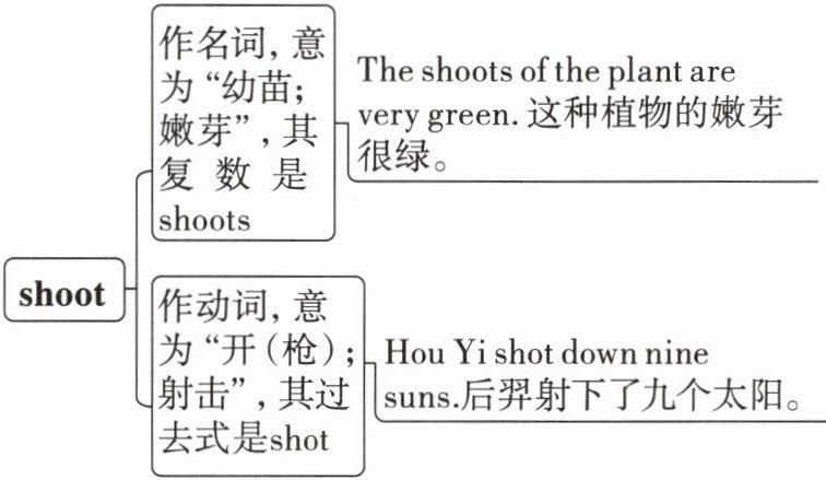 A[shoot] --> B[作名词,意为“幼苗;嫩芽”,其复数是shoots]