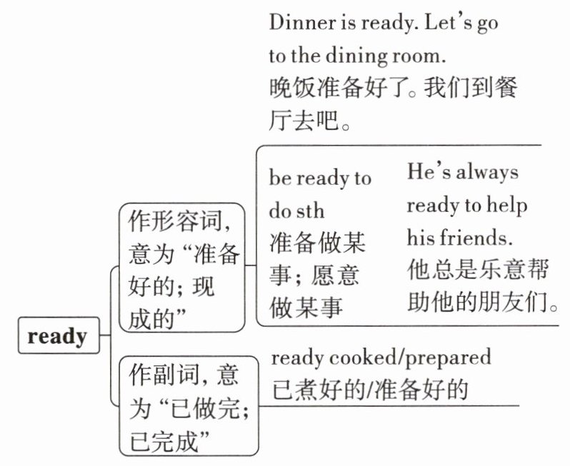 |ready|作形容词,意为“准备好的;现成的”|be ready to do sth 准备做某事;愿意做某事|He's always ready to help his friends. 他总是乐意帮助他的朋友们。|