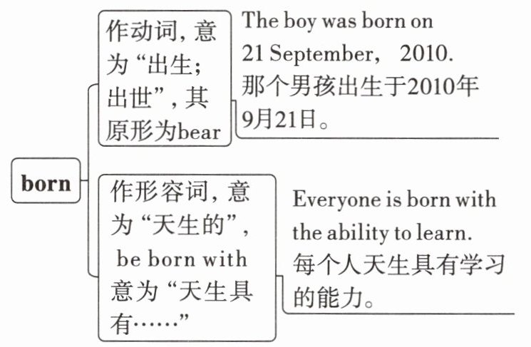 A --> C[作形容词,意为“天生的”,be born with意为“天生具有……”]
