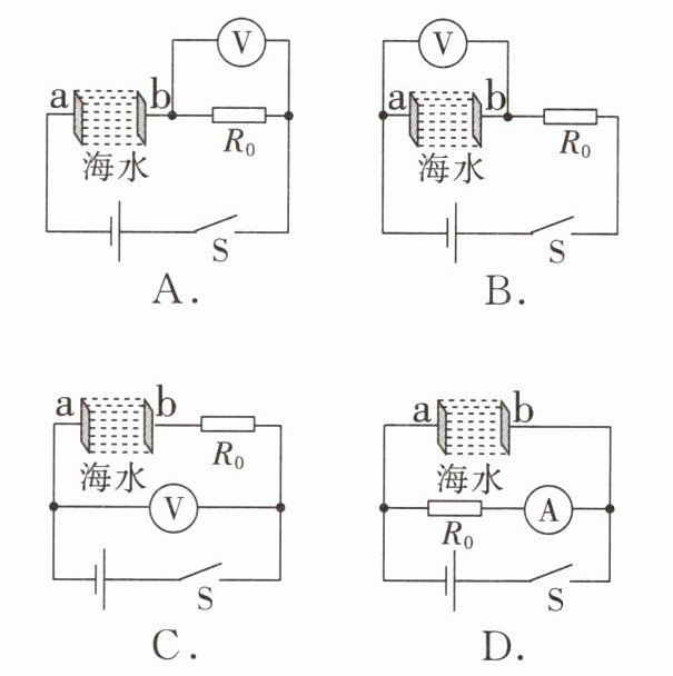 6. (2024 常州)海水盐浓度越大,其导电性越好,固定间距金属片 a、b 之间海水的电阻越小。下列电路中,电源电压恒定,R₀ 为定值电阻,闭合开关 S,海水盐浓度越大,电学仪表示数越大的是(