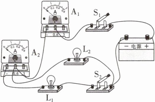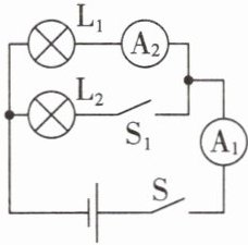 B. 电流表$ A_1 $测通过$ L_1 $的电流C. 当开关$ S_2 $断开时,通过$ L_2 $的电流变小