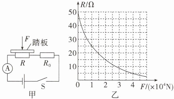 7. 高速公路收费站往往通过地磅检测汽车载重情况。图甲是跨学科学习团队设计的可视化地磅的电路原理图。该电路主要由踏板(重力不计)、压力传感器 R、显示承重的仪表(实质为电流表,测量范围为 0~0.6 A)等组成,R 的阻值与所受压力 F 的大小关系如图乙所示。电源电压为 12 V,定值电阻 R₀ 的电阻为 5 Ω。