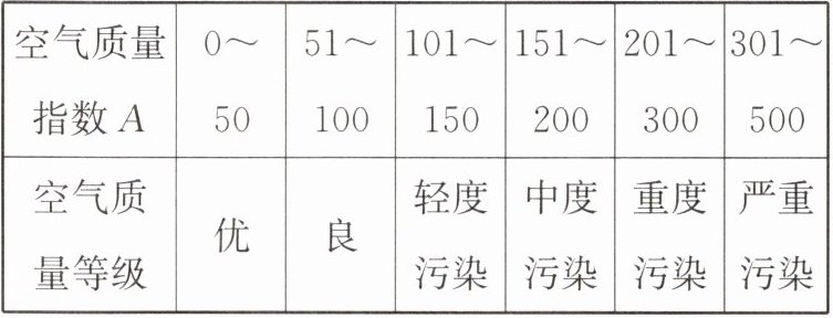 |空气质量指数 $ A $| $ 0 \sim 50 $| $ 51 \sim 100 $| $ 101 \sim 150 $| $ 151 \sim 200 $| $ 201 \sim 300 $| $ 301 \sim 500 $|
