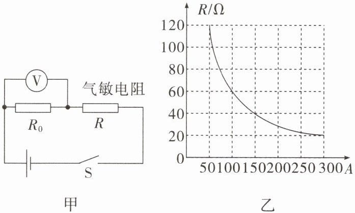 某兴趣小组自制的空气质量监测仪,用电压表显示空气质量指数 $ A $,其工作原理电路图如图甲所示,已知电源电压 $ U = 18 V $,$ R_0 $ 是定值电阻,气敏电阻 $ R $ 的电阻与 $ A $ 的关系如图乙所示 ($ R $ 与 $ A $ 成反比),当空气质量指数 $ A $ 为 $ 100 $ 时,电压表示数为 $ 12 V $。求: