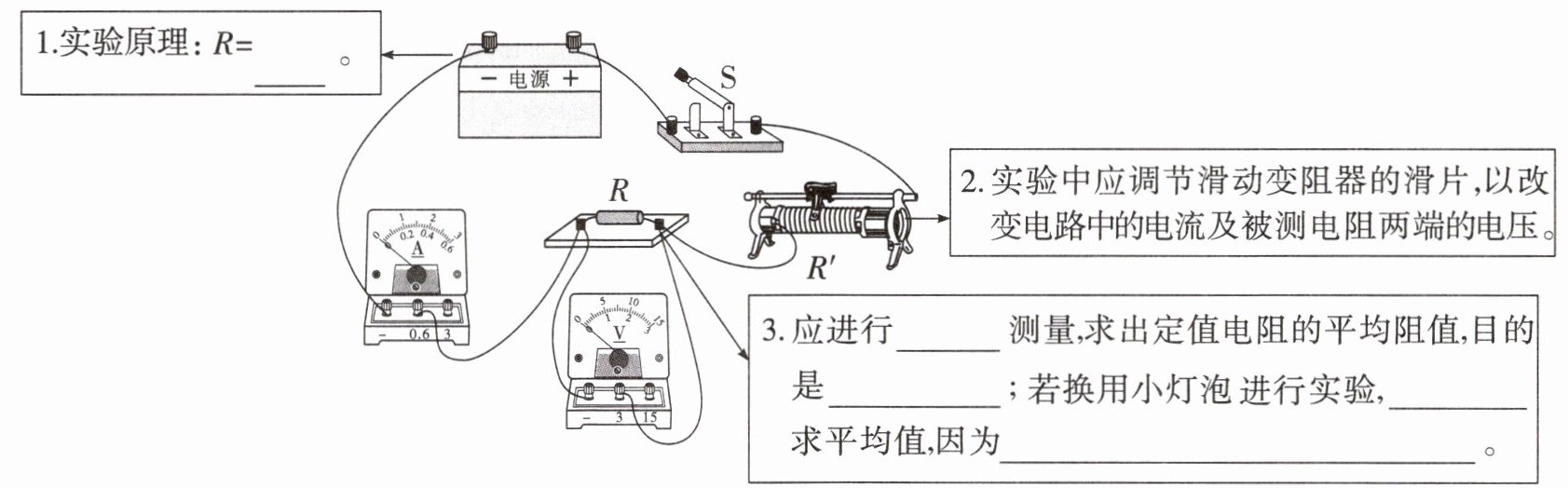 2. 实验中应调节滑动变阻器的滑片,以改变电路中的电流及被测电阻两端的电压。