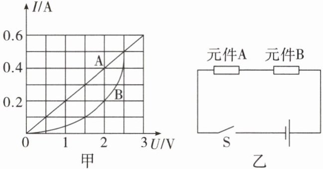 7. 有两个电路元件A和B,流过元件的电流与其两端电压的关系如图甲所示,把它们串联在电源电压为2 V的电路中,如图乙所示。闭合开关S,这时电路中流过元件A的电流是