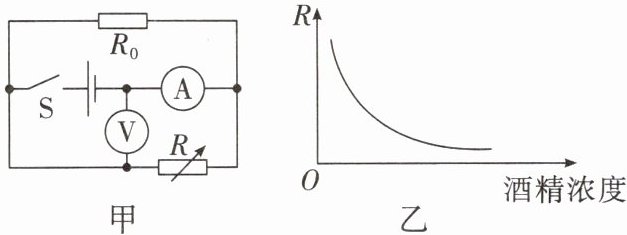 3. (2024 东营)图甲是某酒精测试仪的简化电路图,$R_{0}$为定值电阻,$R$为酒精气体传感器,其阻值随酒精浓度变化的图像如图乙所示。若电源电压不变,闭合开关,当$R$周围酒精浓度增加时,下列判断正确的是(