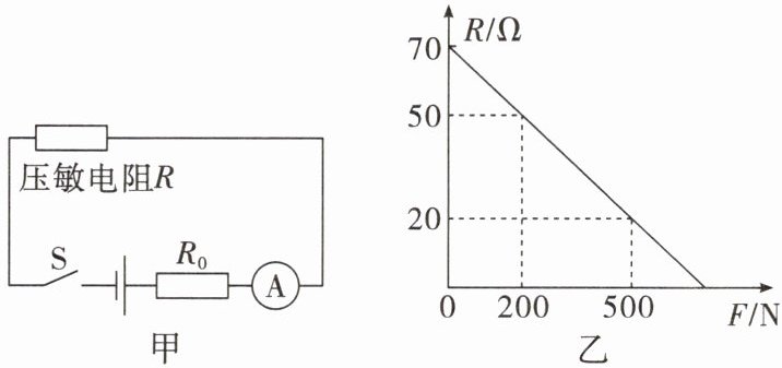 压敏电阻是用半导体材料制成的电阻,其阻值随压力的变化而变化。阻值随压力增大而变小的,称为负压力系数压敏电阻;阻值随压力增大而变大的,称为正压力系数压敏电阻。小明利用压敏电阻设计了一套测量体重的装置,其工作原理如图甲所示,电源电压恒为 12 V,定值电阻$R_{0}$的阻值为 10 Ω,装置中用到的压敏电阻$R的阻值随所受压力F$变化的关系如图乙所示。