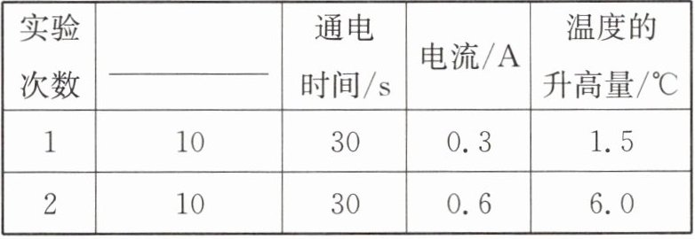 (2)小明先读出烧瓶内液体的初温,闭合开关,通电$30\ s$,再读出烧瓶内液体的温度,得到温度的升高量,填入表中,然后移动滑动变阻器的滑片改变电流大小,重复上述操作,获得了第二组数据(如表所示)。