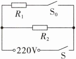6. 某饮水机有加热挡和保温挡,其电路原理如图所示,其额定电压为 $220\space V$,$R_{1}$、$R_{2}$为定值电阻,$R_{1}= 110\space \Omega$,保温挡的额定功率为 $44\space W$。