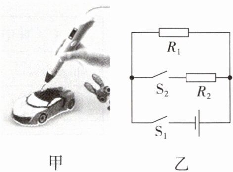 5. 图甲是用某款$3D$打印笔进行立体绘画时的场景,打印笔通电后,笔内电阻丝发热使笔内绘画材料熔化。加热电路简化后如图乙所示,电源电压恒为$6\space V$,$R_{1}和R_{2}$为发热电阻丝,只闭合$S_{1}$时低温挡工作,$S_{1}$、$S_{2}$都闭合时高温挡工作,高温挡和低温挡的功率比为$4:3$,$R_{1}= 4\space \Omega$。忽略电阻丝电阻随温度的变化,求: