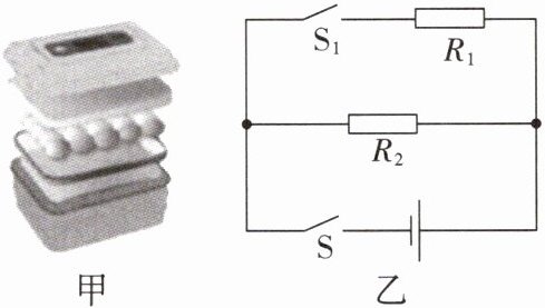 10.(2024 深圳)图甲是某款鸡苗孵化器,底部装有加热器。通电后,加热器对水加热,水向上方鸡蛋传递热量,提供孵化所需能量。孵化器的简化电路如图乙所示,$ R_1 $、$ R_2 $ 都是发热电阻,孵化器的相关参数如表所示。