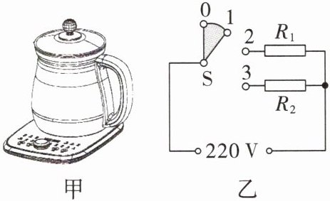 9.(2025 罗山县期末)如图甲所示,这是家庭常见的养生壶,正常工作时的电压为 $ 220 V $,该养生壶有“加热”和“保温”两个挡位(如图乙所示),其中加热挡功率为 $ 1100 W $,加热电阻 $ R_1 $ 的阻值为 $ 220 \Omega $。当双触点开关 $ S $ 接触 1 和 2 时,养生壶处于