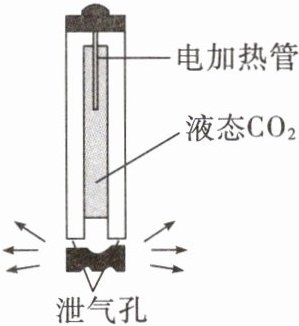 8. 二氧化碳$(CO_2)$爆破技术是现代工程建设中非常环保的技术。起爆前,高压泵将$CO_2$压缩成高压气体,液化后输入爆破筒内。如图所示,爆破时电加热管发热,使筒内的液态$CO_2$迅速汽化,形成的高压气体从泄气孔中喷出,实施爆破。下列说法正确的是(