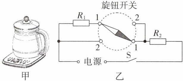 11.(2025 金平区期末)“工夫茶”是潮汕地区的一种传统饮茶文化。如图甲所示是泡茶的电茶炉,图乙是其内部电路的简图,通过旋转旋钮开关可以实现加热和保温两种功能的切换。电源电压为 $ 220 V $,保温功率为 $ 44 W $,$ R_1 $、$ R_2 $ 均为加热电阻,忽略温度对电阻的影响,$ R_2 $ 的电阻为 $ 55 \Omega $,求: