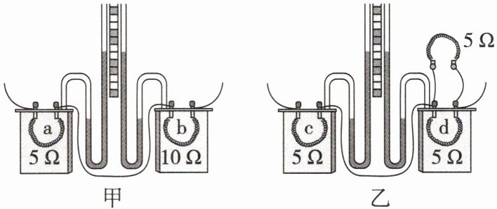 13.(2025 昭通期末)如图所示是“探究电流通过导体产生的热量跟哪些因素有关”的实验装置图。将四段电阻丝 $ a $、$ b $、$ c $、$ d $ 分别密封在完全相同的盒子内,盒内封闭一定量的空气,图乙中另取电阻为 $ 5 \Omega $ 的电阻丝在盒外与盒内电阻并联。