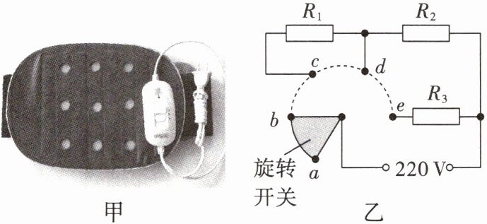 12.(2024 广州)某电热敷腰带如图甲所示,有高温、中温和低温三个挡位,图乙是其内部简化电路图,$ R_1 $、$ R_2 $、$ R_3 $ 为加热电阻,其中 $ R_1 $、$ R_2 $ 的电阻均为 $ 1100 \Omega $,通过旋转开关可以实现挡位切换。把电热敷腰带接入 $ 220 V $ 的家庭电路中。